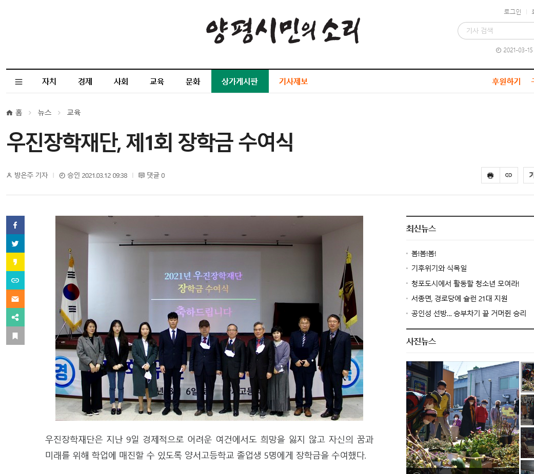 [¾çÆò½Ã¹ÎÀǼҸ®] ¿ìÁøÀåÇÐÀç´Ü, Á¦1ȸ ÀåÇÐ±Ý ¼ö¿©½Ä(2021.03.12.)
